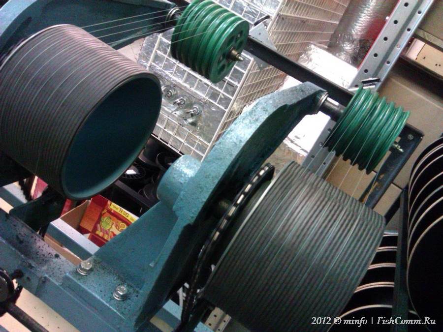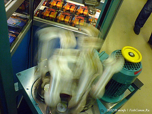 Шпули нахлобучены на штыри станков, рубильники врублены, электроприводы запускают карусель, и процесс плетения плетенки AQUA возобновляется. Десять сантиметров шнура плетутся примерно 30-60 секунд (ну, навскидку). Я, конечно, сильно удивился такой невысокой скорости процесса. Вшвырнуть и оторвать полсотни метров можно за пару секунд. С другой стороны, это ж «ломать – не строить», а тут микроскопически художественный процесс как-никак.