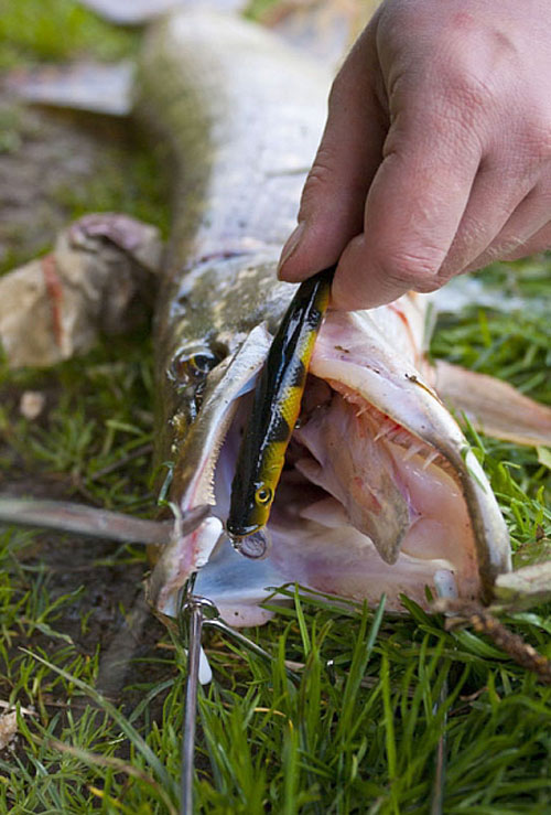 Волнения о том, что щука сойдёт, явно были излишними – воблер находится глубоко в глотке, задний тройник зацепился за жабры. Жалко, можно было бы отпустить, а теперь придётся забирать… Но как схватила-то! На фоне практически нулевой активности – очень жадная поклёвка, видимо, приманка рыбе уж очень понравилась. Хорошо что хотя бы зевник и корнцанг я взял с собой, иначе порезанные в кровь руки гарантированы. Но повозиться всё равно приходится – уж слишком жадно хищница схватила воблер. Беспристрастные весы на базе показали, что весит рыба 2,3 кг. Не рекорд, конечно, но вполне приятная добыча.