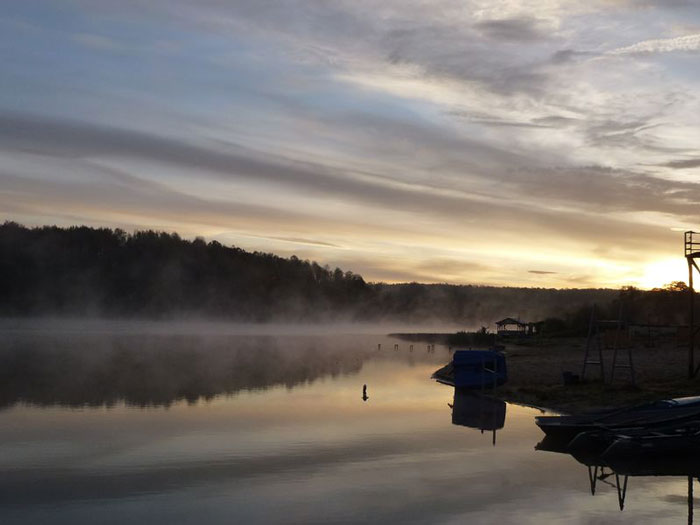 Утро встречает густым туманом, через который еле видно противоположный берег. Впрочем, светает пока ещё быстро, и вскоре от него остаётся лишь лёгкая дымка, вносящая в окружающие пейзажи свою изюминку. Вчерашние «клёвые» точки манят своей близостью и вероятностью хорошего клёва (вряд ли мы поймали всю рыбу), но мы не поддаёмся – бОльшая часть пруда ещё не исследована, к тому же завсегдатаи этого места раскрыли вчера вечером пару точек, где им попадалась наиболее крупная рыба.