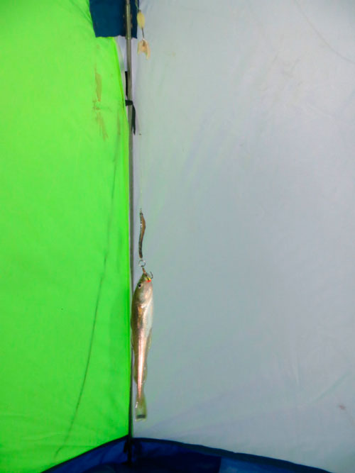 Наступает затишье, вода притормаживает. Небольшой корюшок долго борется с приманкой, наконец удается засечься.