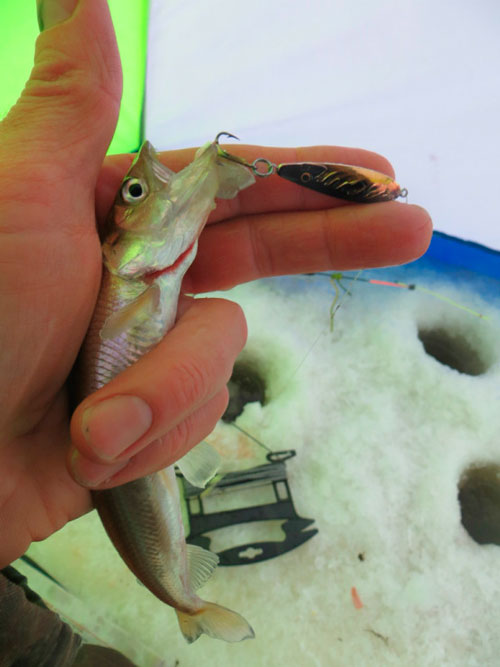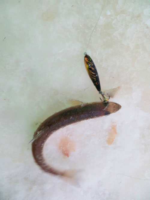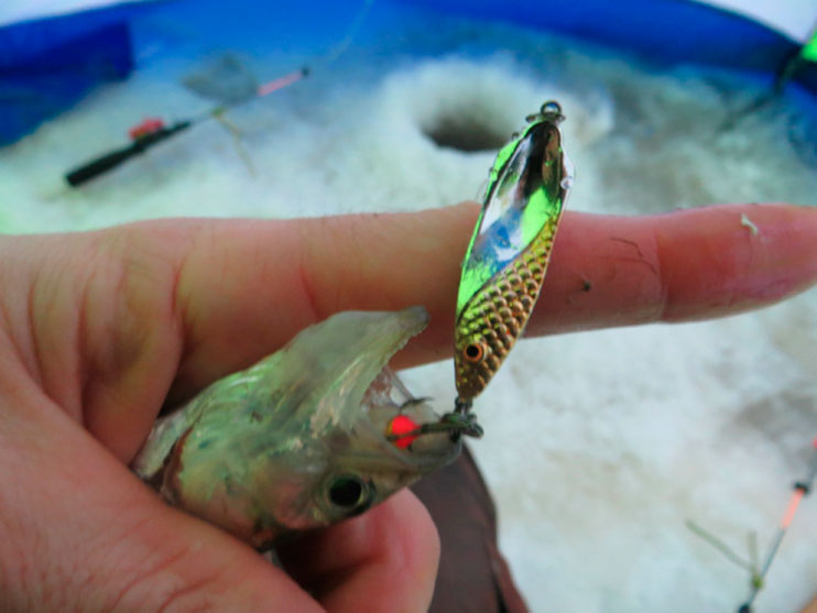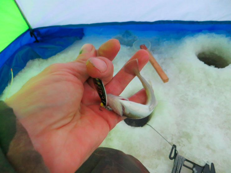 Прихватываю рукой, снимаю осторожно с блесенки, отпускаю обратно в лунку подрастать.
