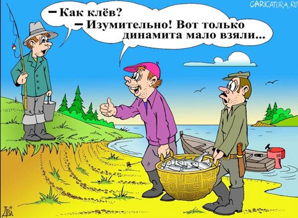 Смешная карикатурка. Опять же, раньше такие в кроколиле часто рисовали. Борьба с браконьерством была в те времена серьезная. Но динамитом все равно рыбу глушили