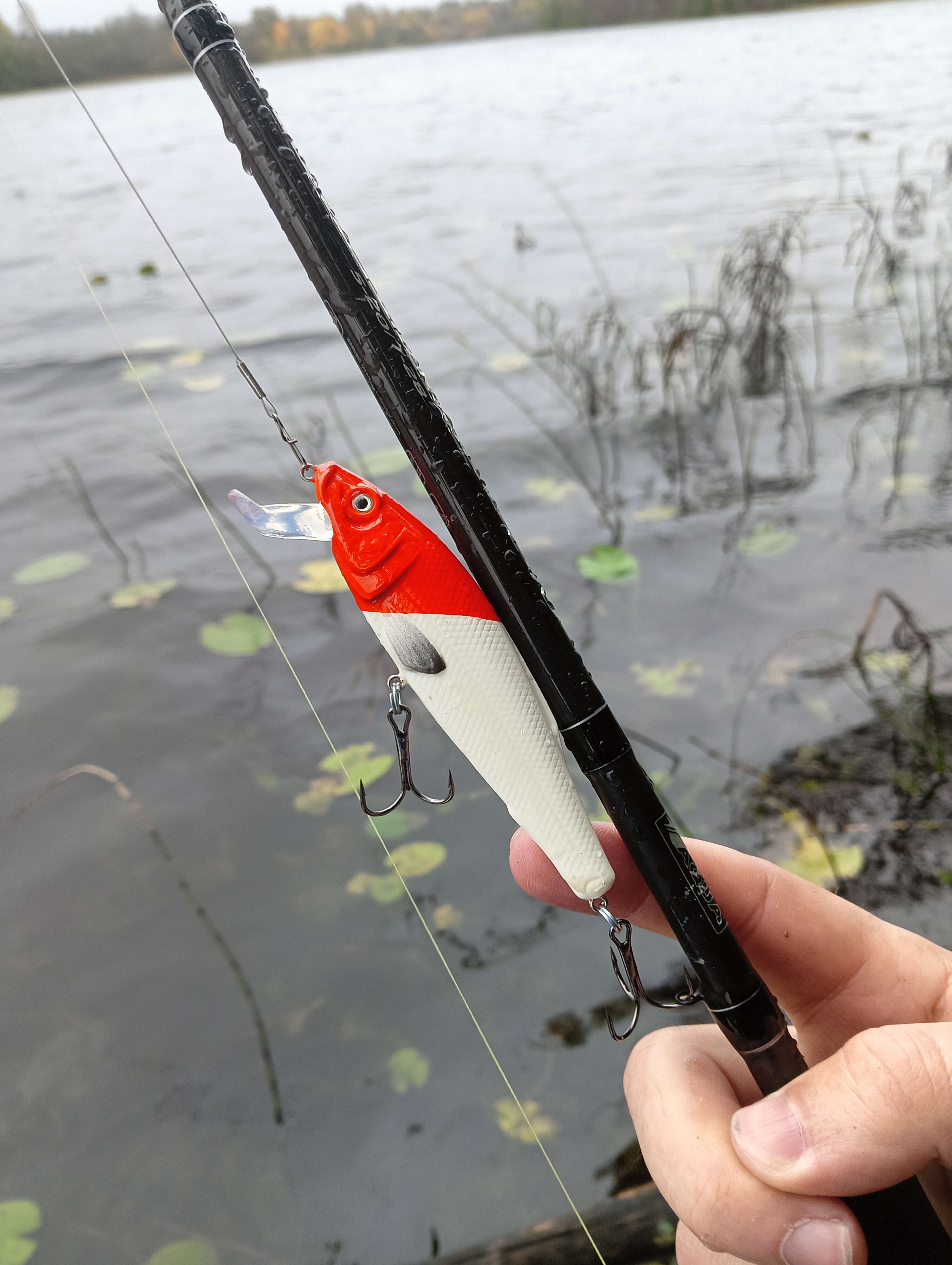 Начал с обкидывания залива, и на очередном забросе во время проводки заметил, что мальки плескаются впереди воблера врассыпную. Ну, в принципе, бывает, что мальки сопровождают приманку, потому что она очень схожа с живой рыбой. Но тут оказалось всё интереснее: это сзади за воблером плыла небольшая щука, и они уплывали от неё. До самой лодки дошла, но, так как, видимо, я ловил стоя, она меня увидела, заподозрила подвох и не стала атаковать воблер.
