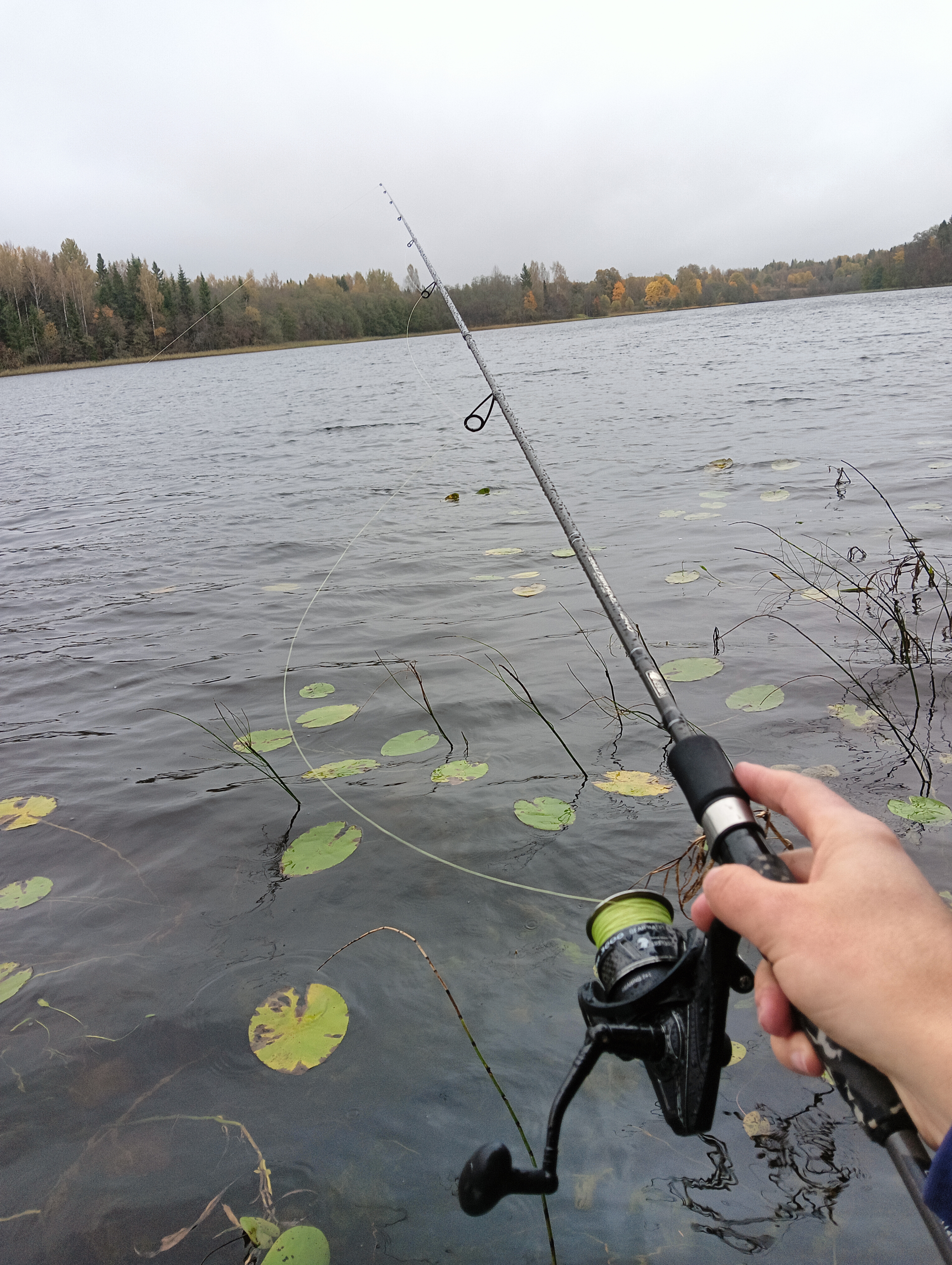 Продолжил ловить по участку вдоль берега. Забросы вдоль травы часто приносят результат, но бывает, что и наоборот: вдоль травы не клюёт, а перпендикулярный заброс работает, и атака следует на первых оборотах катушки спиннинга. Но на этот раз ввиду погодных условий я мог использовать заброс только вдоль берега, и это принесло результат почти сразу.
