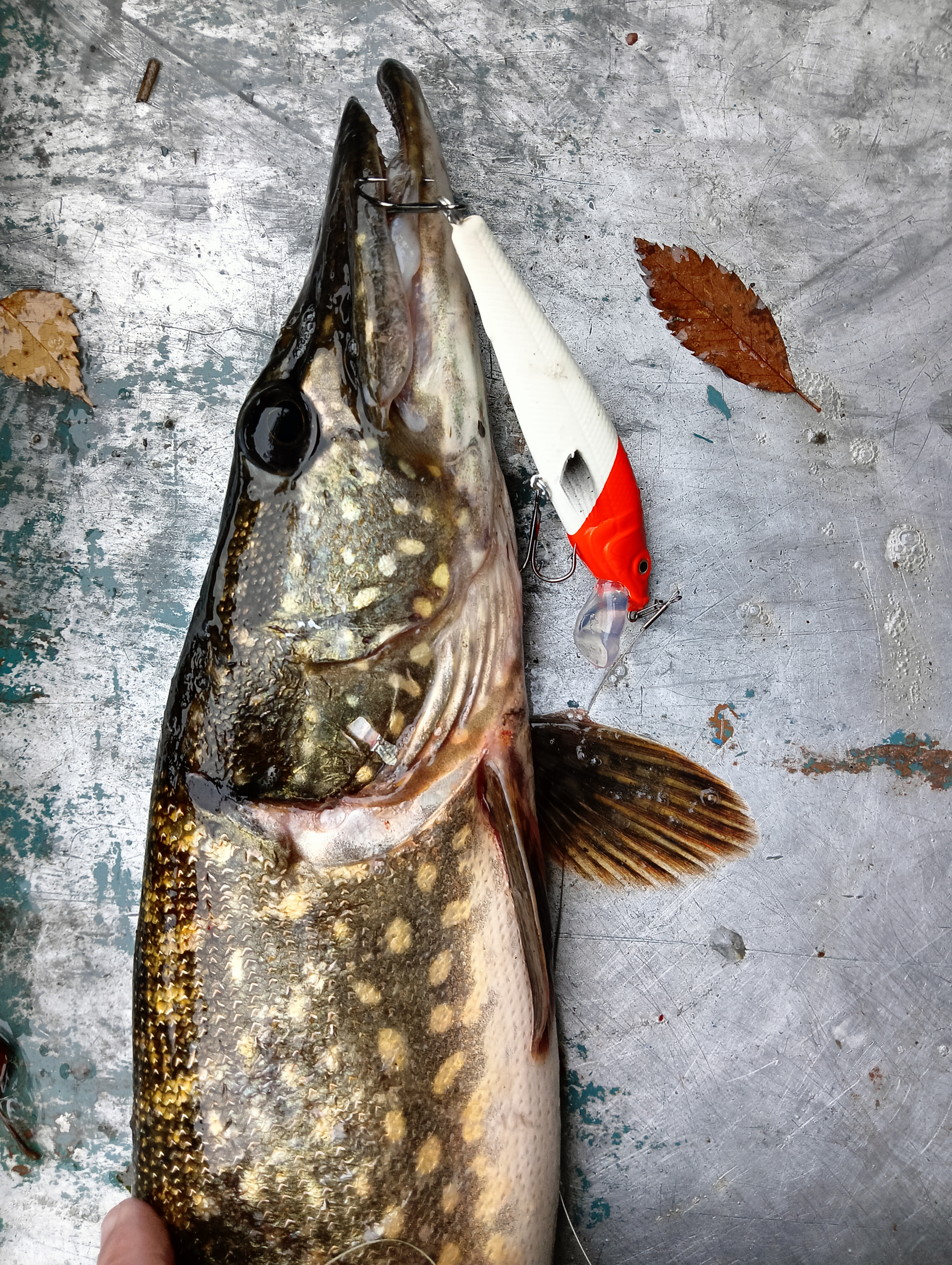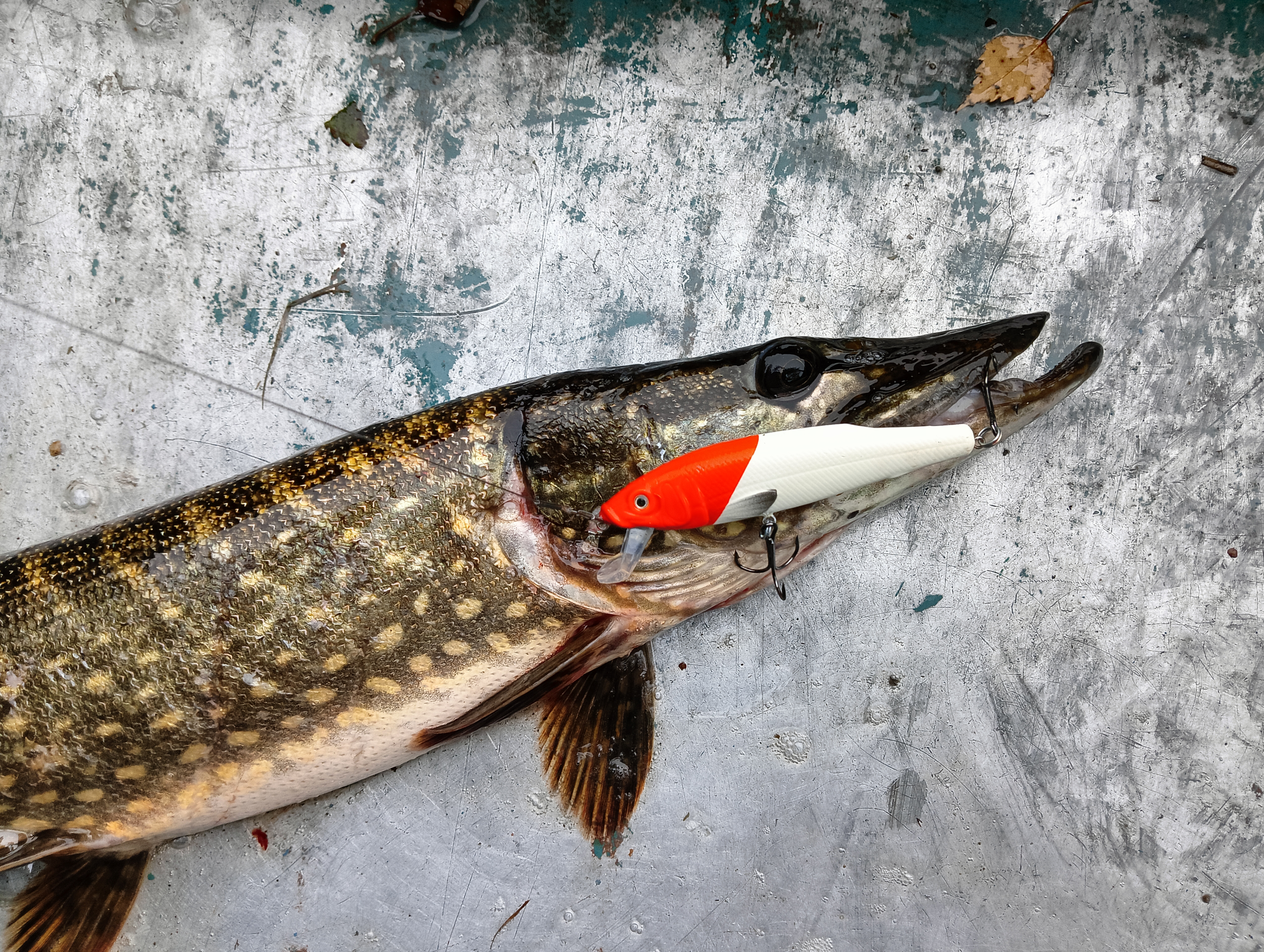 Тут тактика ловли была следующая: максимально дальний заброс и быстрое заглубление воблера до рабочего диапазона, а дальше — эксперименты с проводкой: со скоростью, длиной паузы и прочим. И это принесло успех. Как и с первой щукой, сработала ступенька: когда на паузе давал чуть всплыть и снова заглублял за счёт проводки, клюнула опять щука, очень похожая по размерам на первую, также за задний тройник, только не в пасти весь воблер.