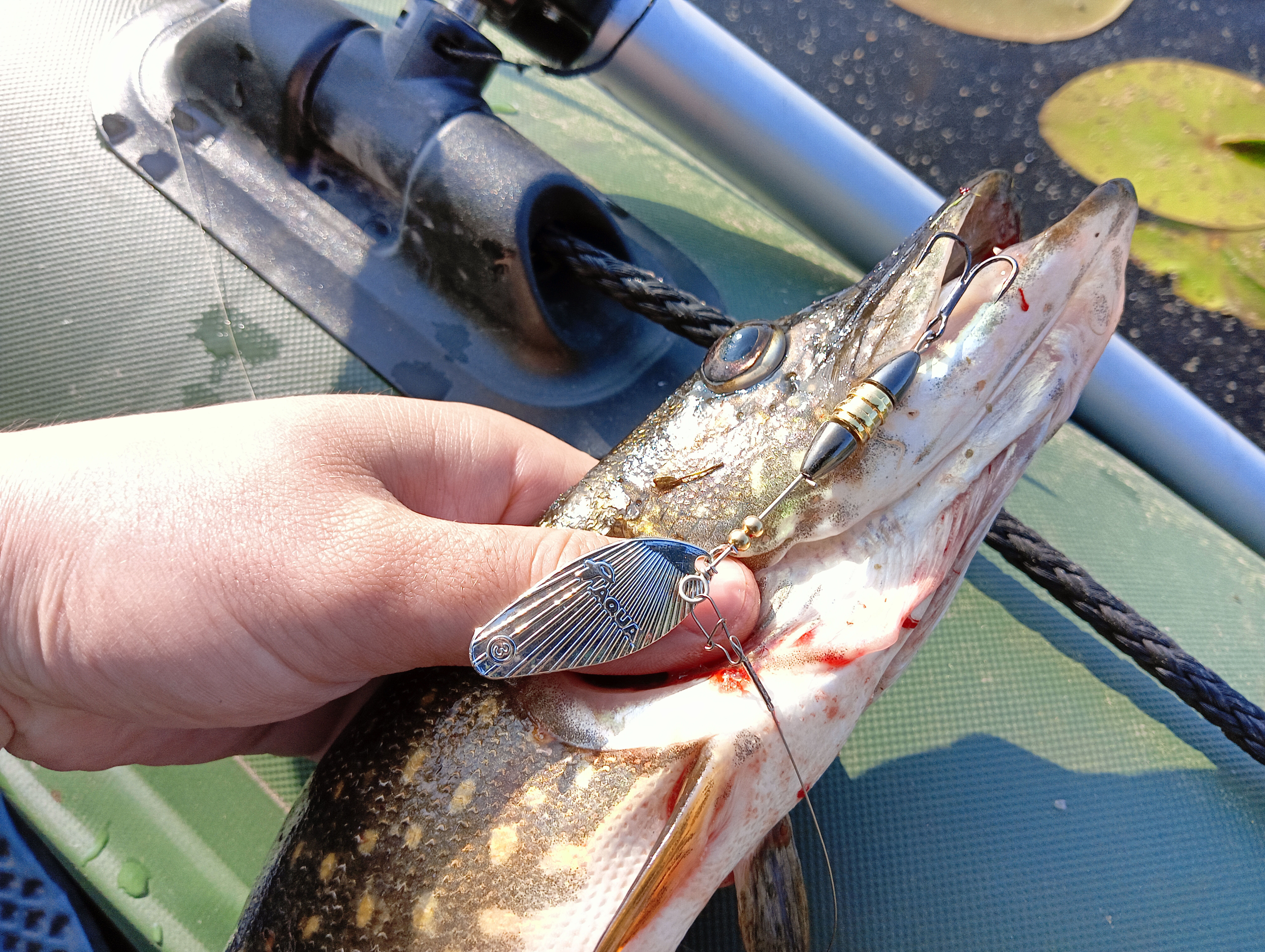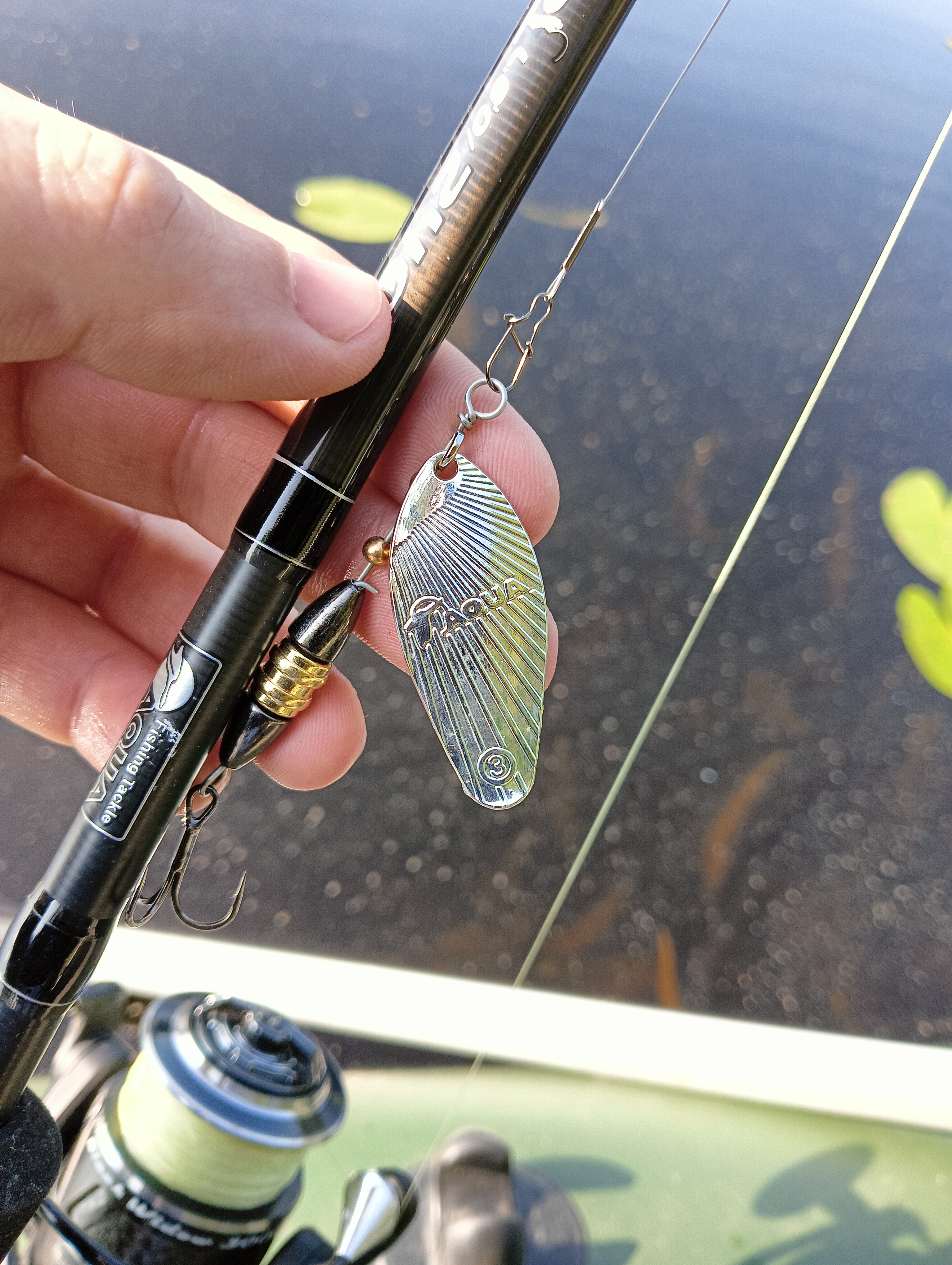 Опустил в воду вертушку — сразу понравилось, как блестит лепесток, видно будет точно издалека. Проверил вдоль лодки, как заводится — с первых мгновений проводки и на малой скорости продолжает уверенно работать.