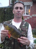 Хороший окунек. Горбатый и зеленый. Такие экземпляры в глубоких местах водятся и щуки даже не боятся. Но ловить непросто