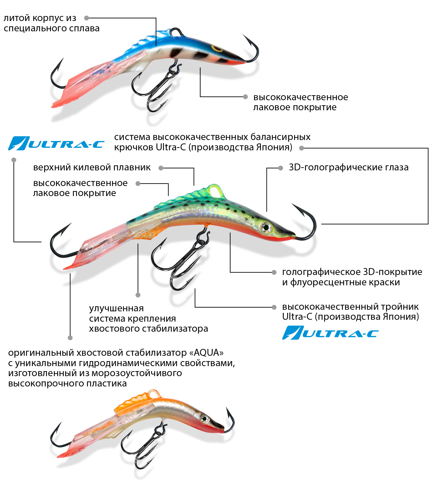 Приманка оснащена системой высококачественных балансирных крючков и тройником Ultra-C (производства Япония), безупречная заточка которых не оставит рыболова без улова.