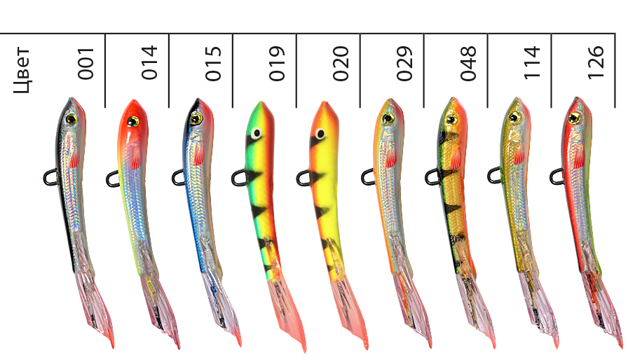 Девять различных расцветок для различных условий освещенности и прозрачности воды позволят Вам подобрать оптимальный вариант для конкретных условий ловли.