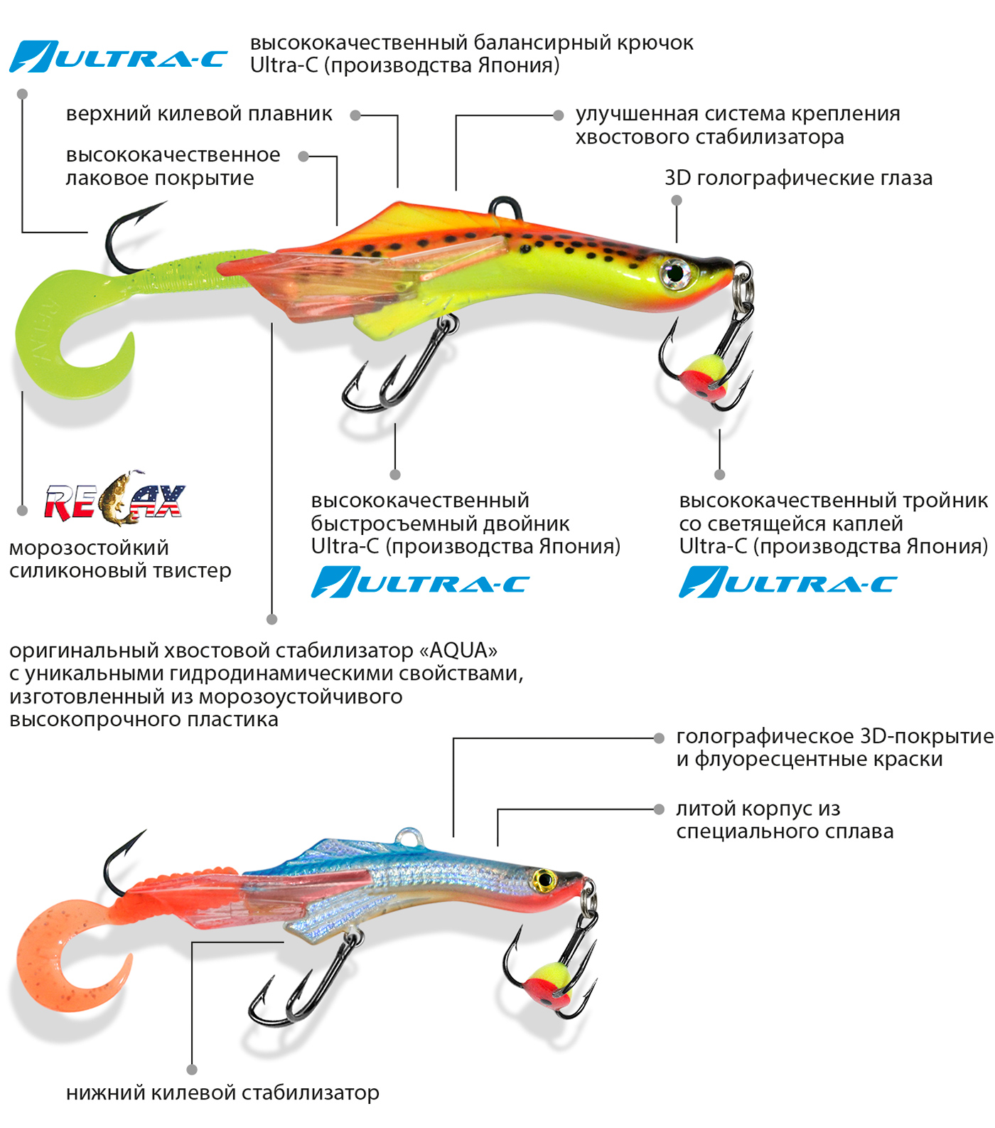 Приманка оснащена системой высококачественных балансирных крючков и тройником Ultra-C (производства Япония), безупречная заточка которых не оставит рыболова без улова.