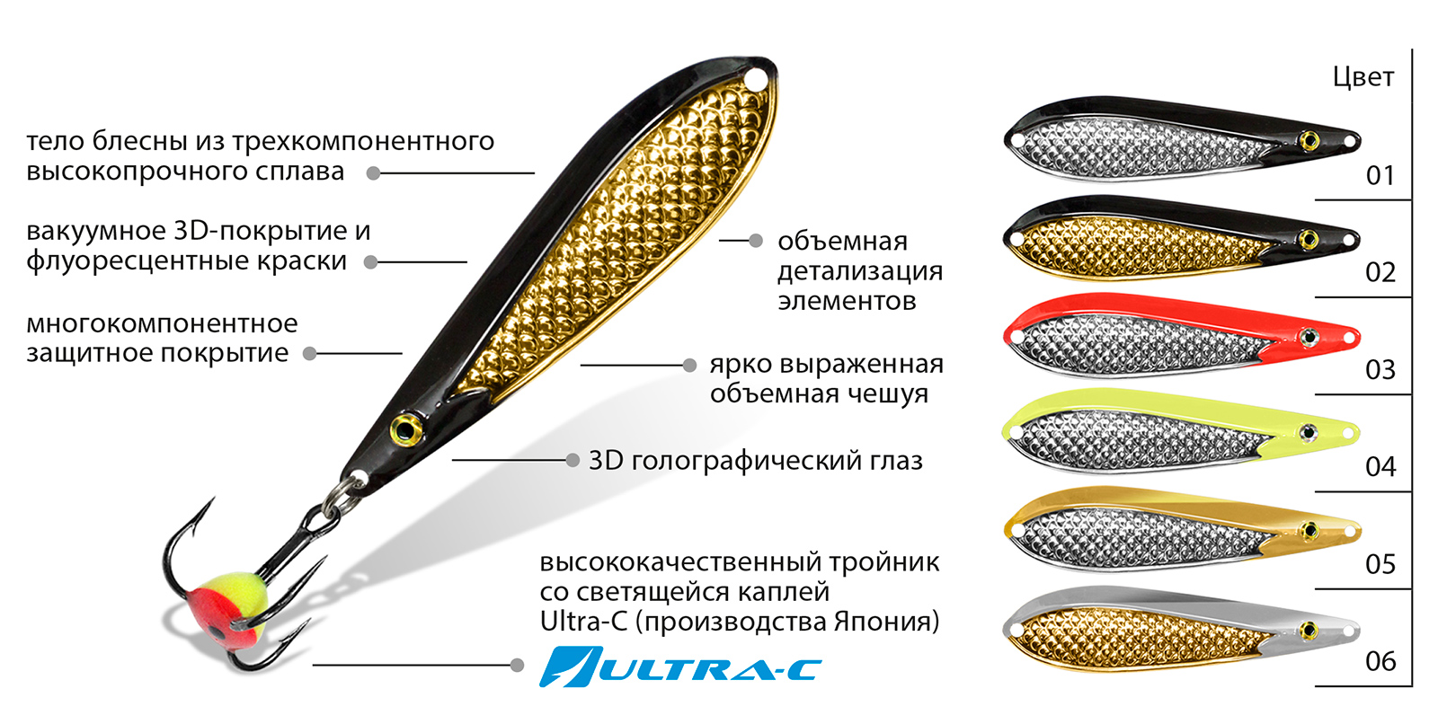 Все блесны оснащены высококачественными японскими тройниками Ultra-C с флуоресцентной или люминесцентной каплей, увеличивающей количество поклевок на 18-27% по сравнению с обычным крючком.