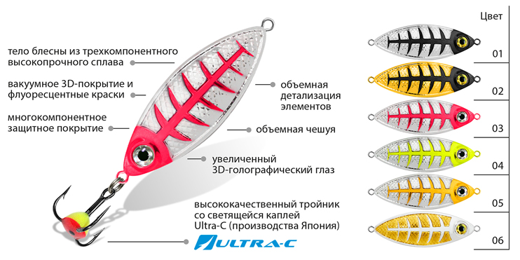 Все блесны оснащены высококачественными японскими тройниками Ultra-C с флуоресцентной или люминесцентной каплей, увеличивающей количество поклевок на 18-27% по сравнению с обычным крючком.