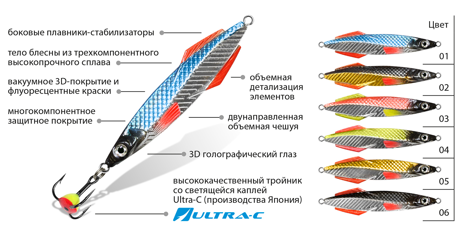 Все блесны оснащены высококачественными японскими тройниками Ultra-C с флуоресцентной или люминесцентной каплей, увеличивающей количество поклевок на 18-27% по сравнению с обычным крючком.