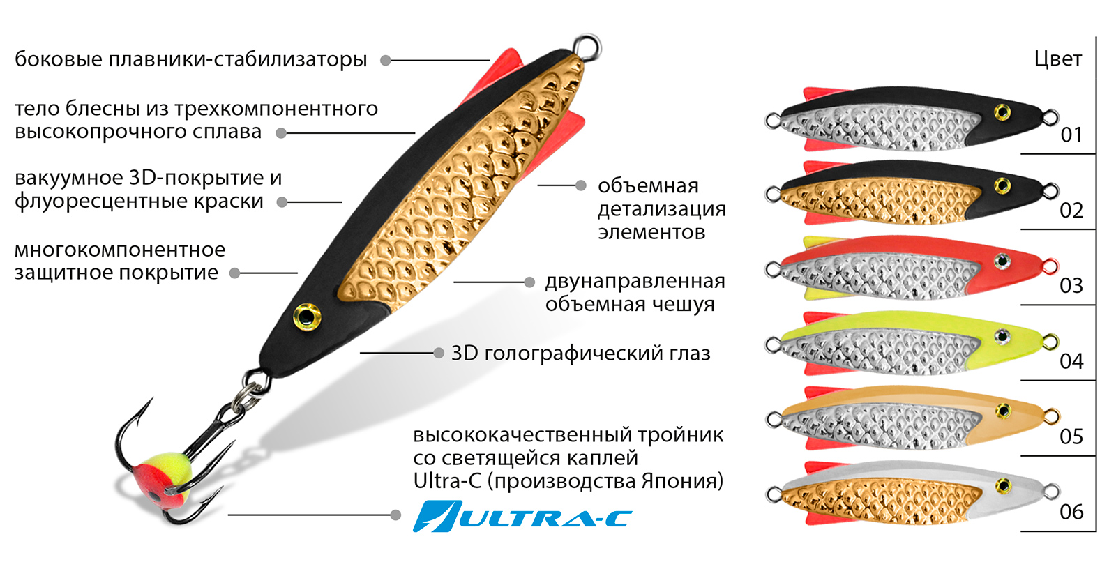 Все блесны оснащены высококачественными японскими тройниками Ultra-C с флуоресцентной или люминесцентной каплей, увеличивающей количество поклевок на 18-27% по сравнению с обычным крючком.