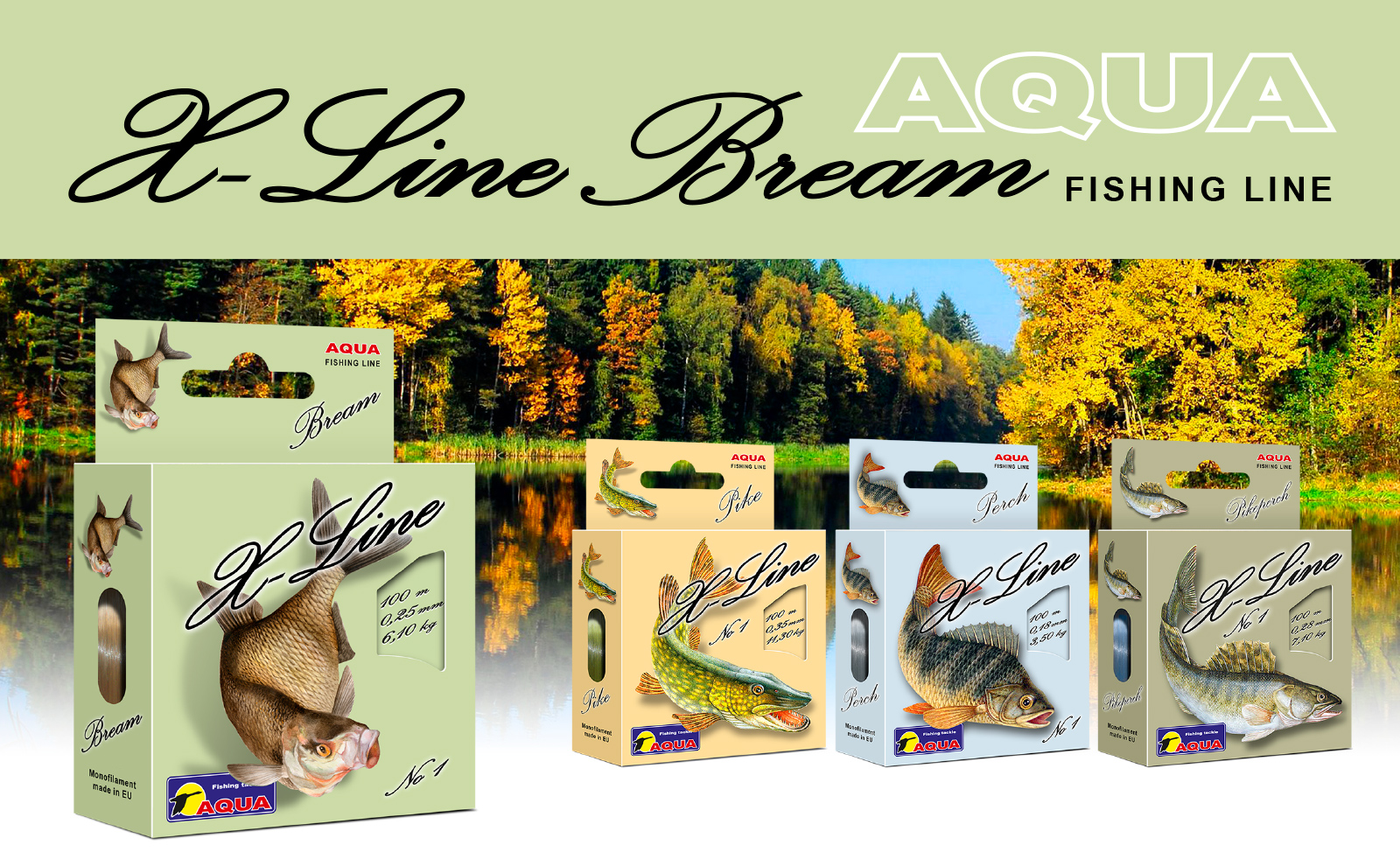 - Леска AQUA X-Line Bream (Лещ) выпускается в светло-коричневом цвете, в диаметрах от 0,16 до 0,40mm, что позволит подобрать подходящий вариант для ловли любой рыбы и различных условий.