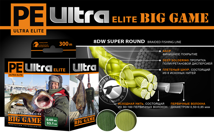 Плетеный шнур AQUA PE ULTRA ELITE BIG GAME для любых видов трофейной или экстремальной рыбалки и глубоководного троллинга (как в соленой, так и в пресной воде) - эта серия идеально круглых, сверхпрочных шнуров из восьми нитей для самых требовательных рыболовов, не готовых идти ни на какие компромиссы в вопросах выбора снастей, и самой крупной рыбы, не прощающей ошибок в выборе шнура.