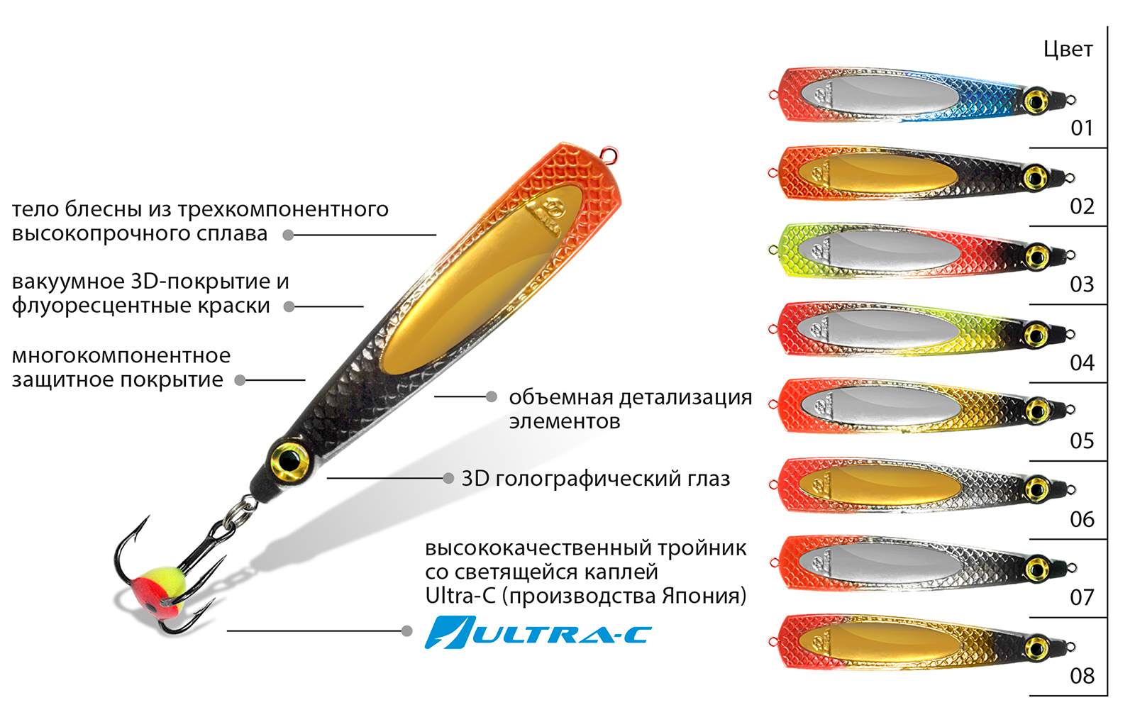Все блесны оснащены высококачественными японскими тройниками Ultra-C с флуоресцентной или люминесцентной каплей, увеличивающей количество поклевок на 18-27% по сравнению с обычным крючком.