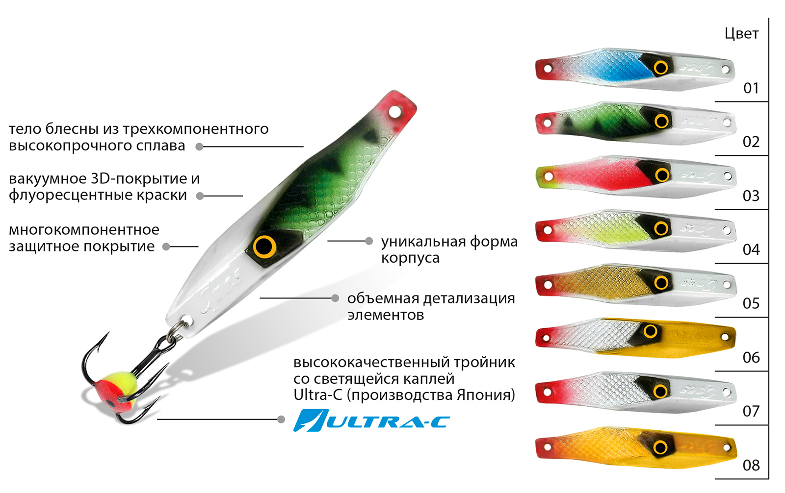 Все блесны оснащены высококачественными японскими тройниками Ultra-C с флуоресцентной или люминесцентной каплей, увеличивающей количество поклевок на 18-27% по сравнению с обычным крючком.