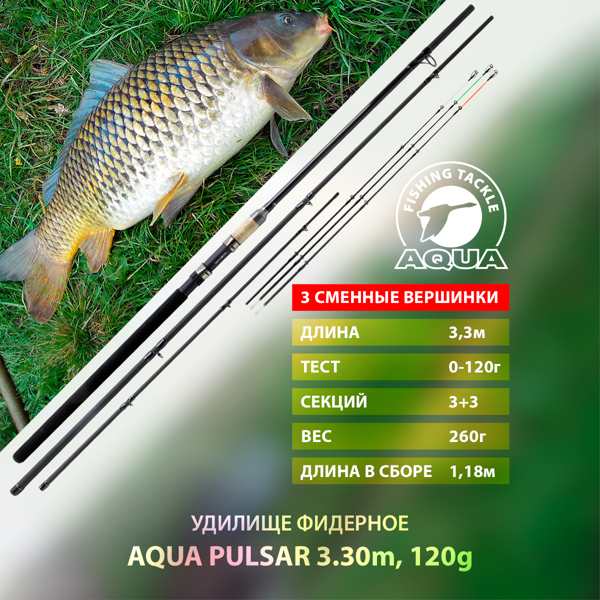 Удилище фидерное для рыбалки AQUA PULSAR 3,30m, тест до 120 грамм - отличный инструмент предназначенный для ловли крупной рыбы на дальних дистанциях. AQUA PULSAR - это серия классических трехсекционных фидерных удилищ класса Хэви фидер (Heavy фидер).