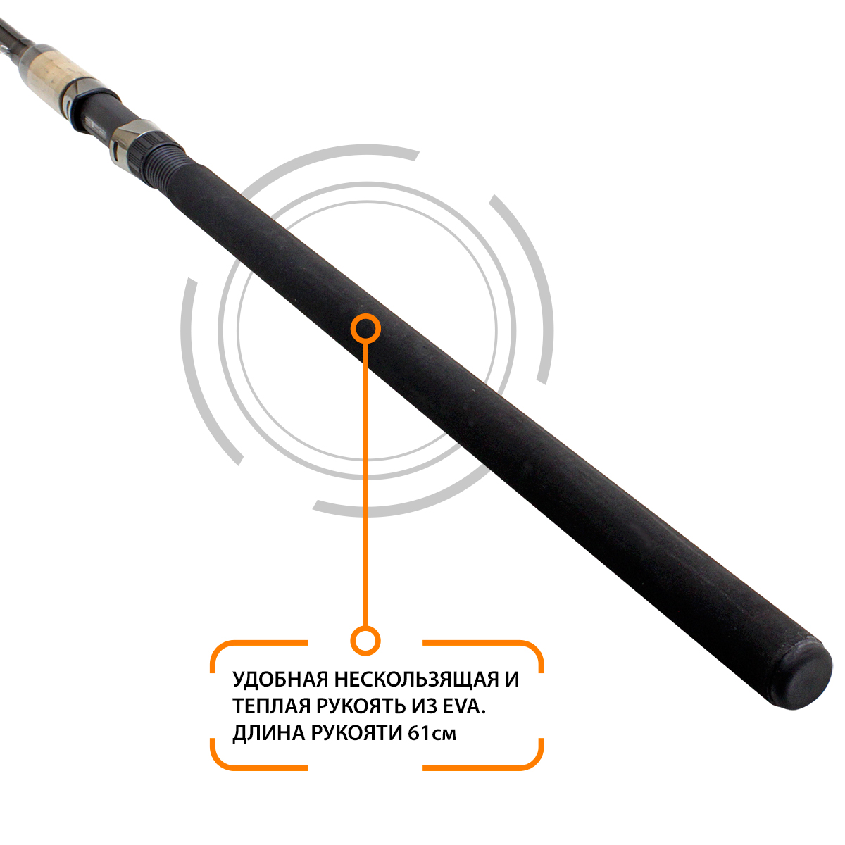 Рукоятка удилища комбинированная, из греющего в руку в холодную погоду нескользящего материала EVA-BIO и натуральной пробки высочайшего качества.
