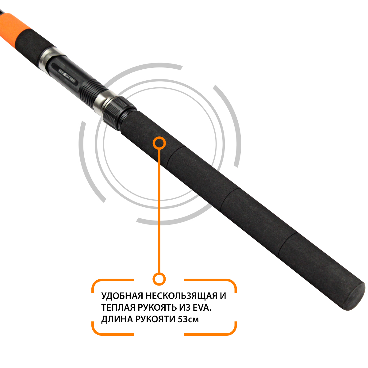 Рукоятка выполненная из греющего руки в холодную погоду синтетического нескользящего материала EVA-BIO отлично ложится в руку и не дает устать руке при длительной рыбалке.
