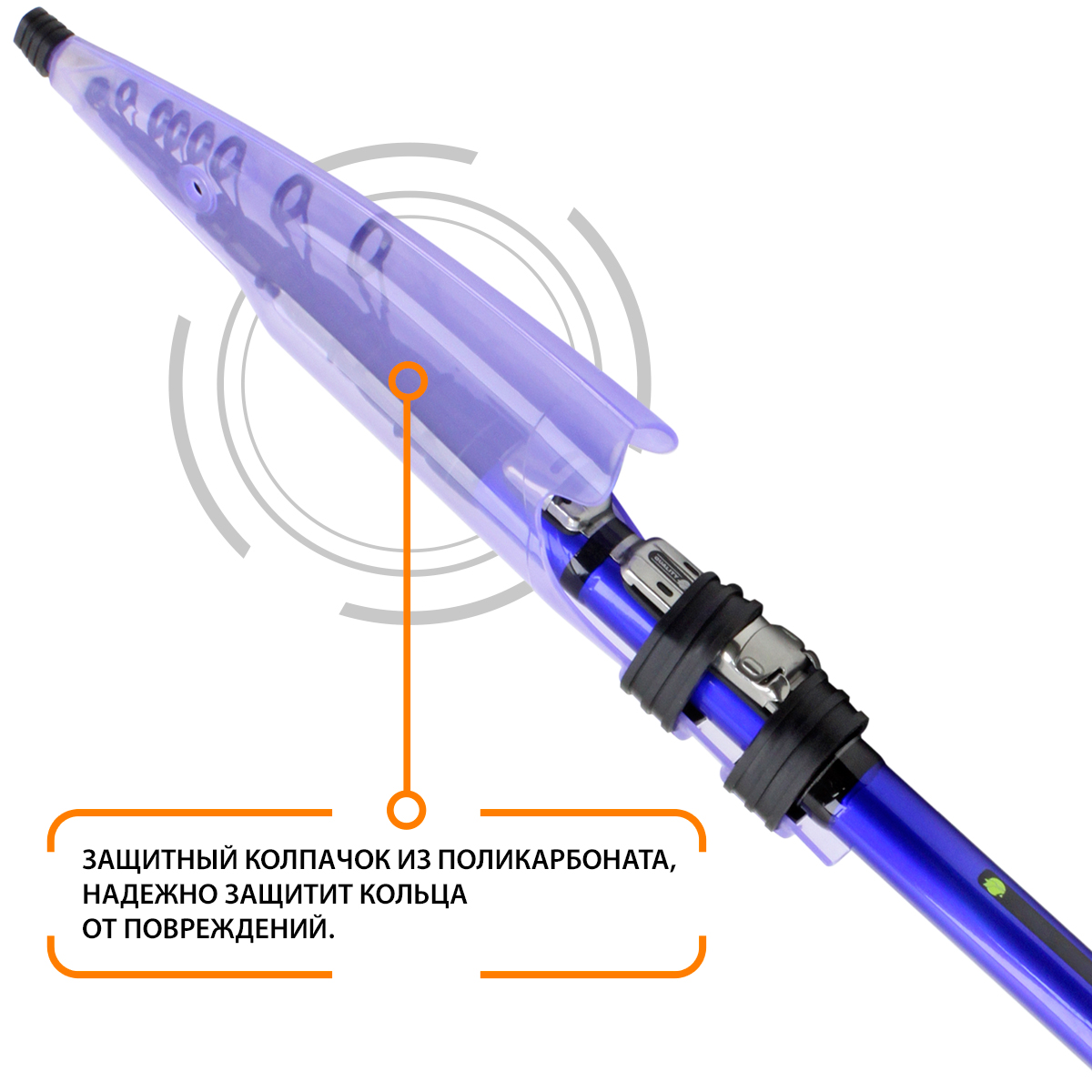 Защитный колпачок из поликарбоната и мягкий чехол для удилища, надёжно защитят кольца и бланк от повреждений при транспортировке.