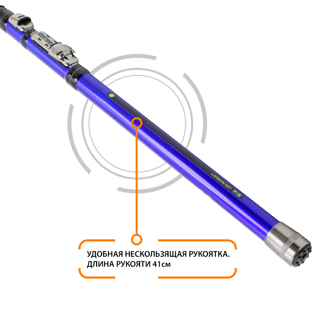 Удилище изготовлено из высокомодульного графита IM7 обладающего выдающимися прочностными характеристикамии и при этом минимальным весом, особенно это актуально, когда удилище в процессе рыбалки приходится постоянно держать в руках и любые дополнительные граммы веса ощущаются, особенно под конец рыбалки.