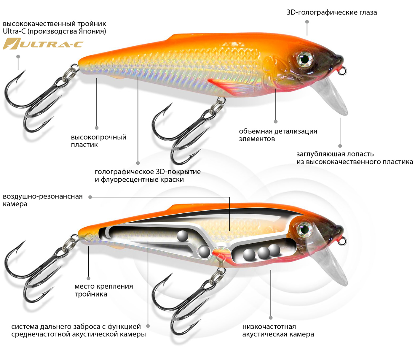 Внутрь корпуса интегрированы средне- и низкочастотная акустические камеры, которые создают дополнительный гидроакустический эффект, привлекающий затаившуюся рыбу со значительных расстояний (до 26m).