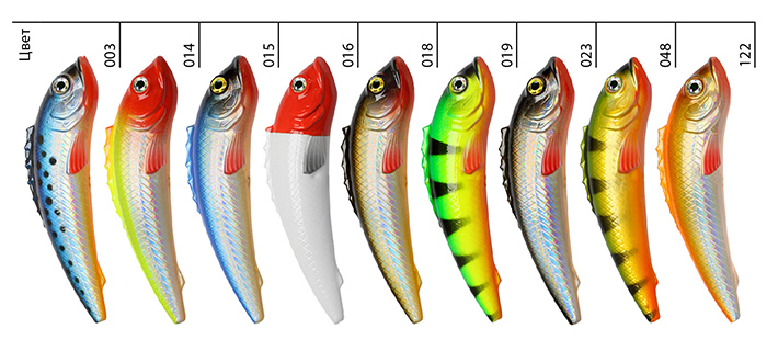 Тщательно подобранные девять расцветок воблера обязательно предоставят Вам возможность сделать успешный выбор, наиболее подходящий для ловли хищной рыбы в любую погоду и на любом водоеме. Любая из предложенных окрасок адаптирована к конкретным условиям: виду рыбы, освещенности, температуре и прозрачности воды.