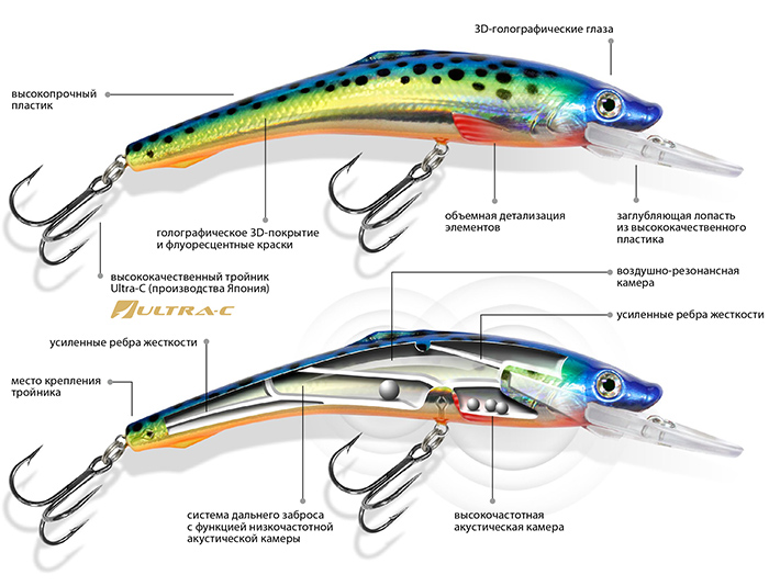 Инновационный воблер созданный с использованием программ моделирования поведения гидродинамических процессов (CFD, от англ. computational fluid dynamics), тщательно подобранный вес металлических шариков-балансировщиков находящихся в интегрированной высокочастотной акустической камере в нижней части тела приманки и увеличенный объем воздушно-резонансной полости в верхней, делают игру воблера стабильной при любых скоростях проводки, как на водоемах с быстрым течением, при троллинге или быстрой проводке и при этом не дает воблеру заваливаться при медленной или рывковой проводке.
