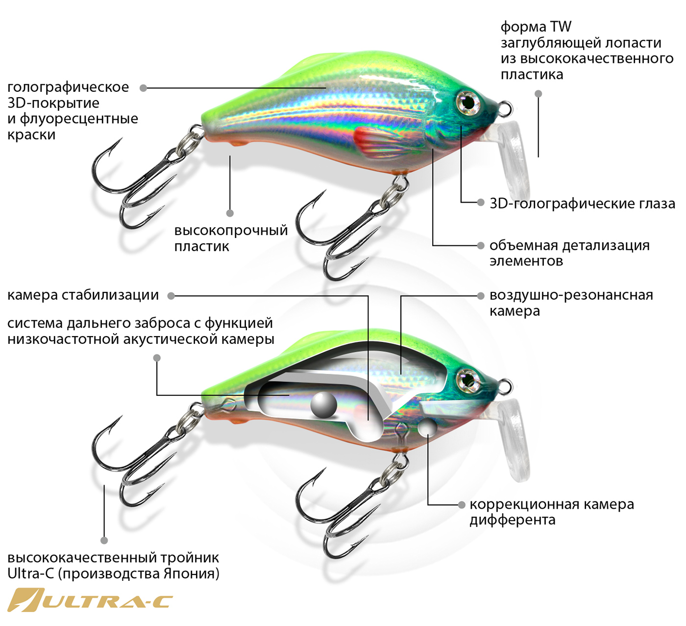 Низкочастотная акустическая камера, интегрированная в тело воблера, создает дополнительный гидроакустический след, привлекающий затаившуюся рыбу со больших расстояний, и заставляет хищника бросаться вслед даже уходящей приманки.