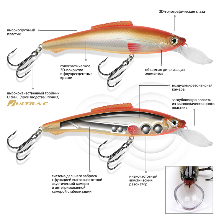 Воблер оснащен высококачественными японскими тройниками Ultra-C оптимального размера, безупречная заточка которых не оставляет улову не малейшего шанса на сход ни мелким представителям хищной фауны водоемов, ни трофейным экземплярам