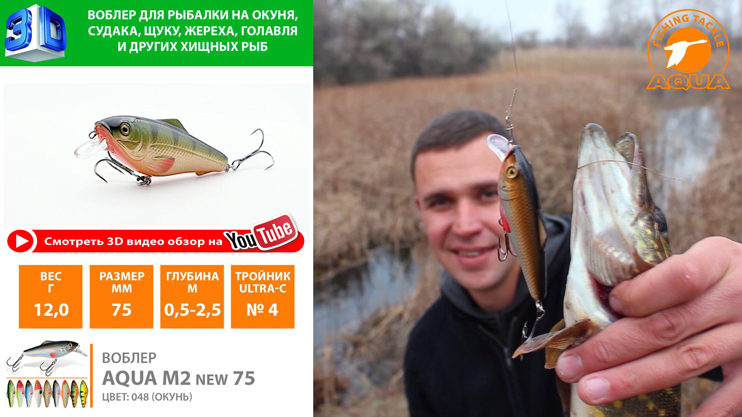 Воблер AQUA M-2 (new) – это среднеразмерный (75mm) воблер с рабочей глубиной от 0,5 до 2,5m.