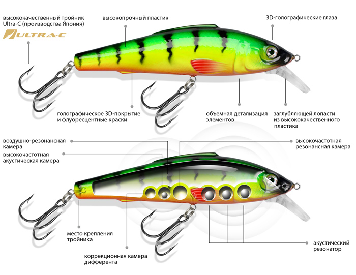 Корпус воблера и заглубляющая лопасть (язычок) изготовлены из ударопрочного пластика неподвластного зубам хищной рыбы и выдерживающая удары о донные камни при проводке, а тщательно подобранный вес шариков-балансировщиков находящихся в интегрированном среднечастотном акустическом резонаторе в нижней части тела приманки и увеличенный объем воздушно-резонансной полости в верхней, делают игру воблера стабильной при любых скоростях проводки, как на водоемах с быстрым течением, при троллинге или быстрой проводке и при этом не дает воблеру заваливаться при медленной или рывковой проводке.
