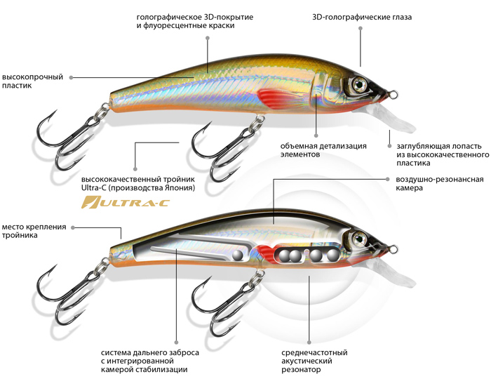 Высококачественные японские тройники Ultra-C оптимального размера, которыми оснащена приманка, рассчитаны на ловлю любой рыбы, а их безупречная заточка позволяют подсечь улов даже при вялой, неуверенной поклевке