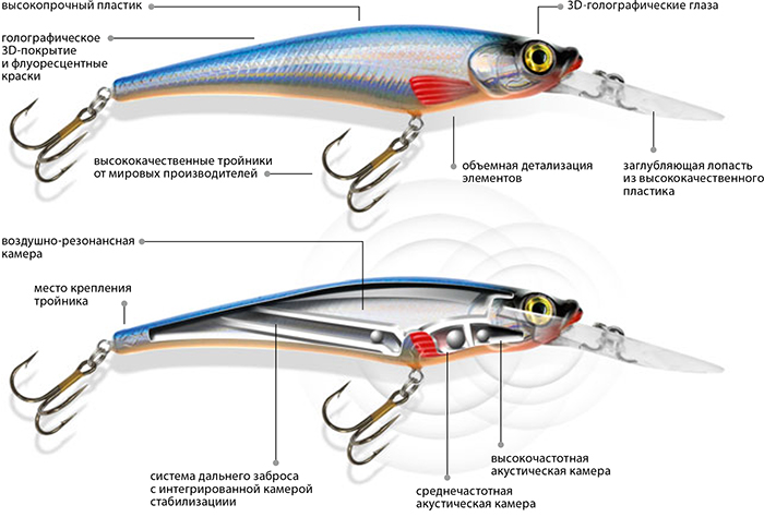 Тело приманки выполнено в форме «сытого малька» плотвы, ельца и других объектов кормовой рыбы на водоеме. Устойчивая высокочастотная игра воблера не теряет своей привлекательности ни на течении, ни на высоких скоростях проводки, что актуально при ловле щуки, окуня, судака и других рыб на троллинг или дорожкой.