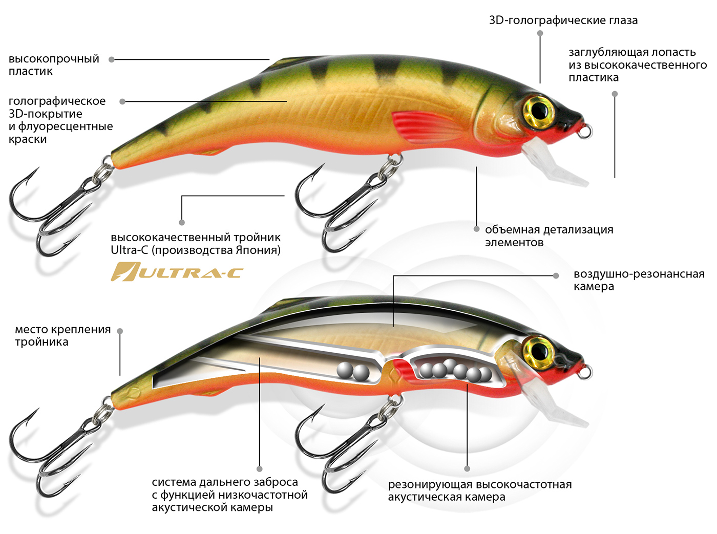 Воблер оснащен высококачественными японскими тройниками Ultra-C оптимального размера № 2, безупречное качество и заточка которых не оставляет улову не малейшего шанса на сход ни мелким представителям хищной фауны водоемов, ни трофейным экземплярам