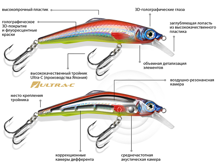 Воблер оснащен двумя высококачественными японскими тройниками Ultra-C оптимального размера № 6, безупречная заточка которых не оставит Вас без улова даже при не очень уверенной поклевке.