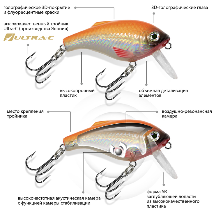 Наличие широкополосного акустического резонатора и двух камер с небольшими металлическими шариками, создающими в процессе лова неповторимые акустические колебания, воспринимаемые боковой линией рыб, что так неотвратимо привлекает любого хищника на глубине не только в зоне «прямой видимости», но и на расстоянии до 17m.