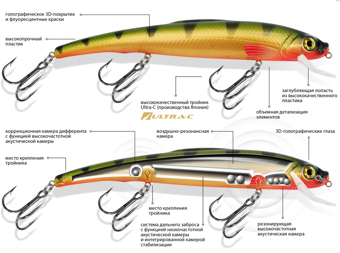 Специальная форма языка обеспечивает данной модели с длинным и объемным телом предсказуемое поведение на среднем и сильном течении при любой скорости проводки.Улан отличная приманка для ловли троллингом. Энергичная игра, четко поделенная на фазы, неотразима для крупной рыбы, а акустический эффект, который создается в шумовой камере приманки, усиливает привлекательность данной модели для хищника.