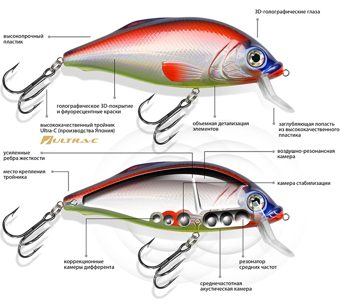 Все воблеры оснащены высококачественными тройниками Ultra-C японского производства.