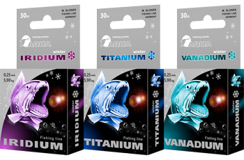 К началу зимнего сезона 2009-2010 года фирма AQUA в сотрудничестве с немецким концерном “M.Slonek GMBh” выпустила зимний вариант лесок из серии “TITATIUM”, так полюбившейся нашим рыболовам. Серия состоит из трех видов лесок - “TITATIUM”, “VANADIUM” и “IRIDIUM” различных цветов (светло-дымчатого, светло-оливкового и голубого), что позволяет подобрать необходимый вариант для любого водоема и любого вида рыб. Зимний вариант лесок серии TITATIUM” проходит дополнительную обработку, делающий её более устойчивой к воздействию низких температур. |