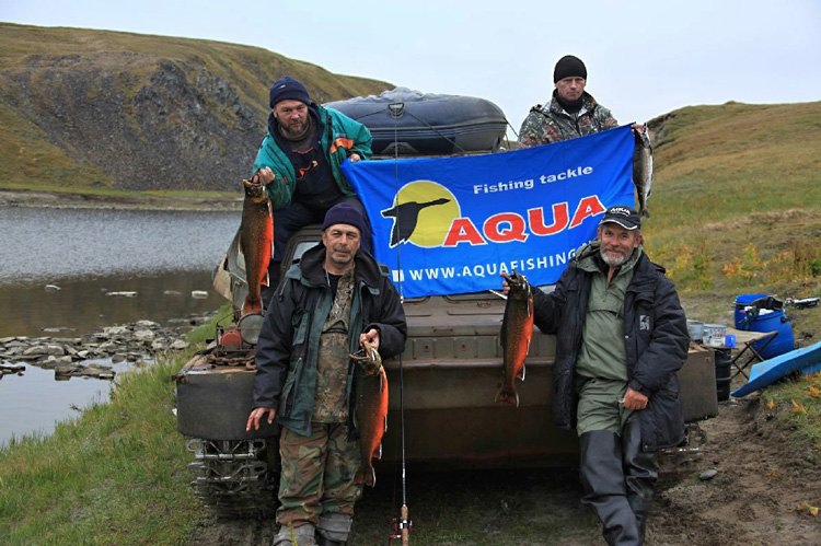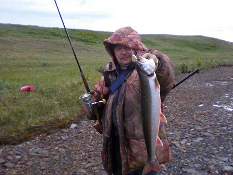 Но перейдём от теории к практике. Как я уже и писал выше, уровень воды в лагуне был высоким. Нужно было походить, поискать рыбу. Да ещё и ветер был северный и сильный. Ловить можно было только с северного берега лагуны, делая забросы по ветру. Попробовав ловить на нахлыст, результатов я не добился. Ни сухие мушки, ни нимфы, ни стримеры рыбу как то не возбудили. Что ж попробуем спиннинг. Я в поездку не взял бомбарды, а зря… Сейчас бы эта снасть очень бы пригодилась. Первую рыбу я смог поймать только на мелкую вертушку. Забросить её далеко без бомбарды не было ни какой возможности. Лучше всего себя зарекомендовали вертушки AQUA AGLIA . Рыбалка в этот день была не очень результативной. Мы смогли поймать лишь несколько рыб. Делать какие то выводы и давать советы по ловле омуля я просто не в праве. Опыт нескольких рыбалок – это не практика. Посвятить больше времени на лов омуля, как это планировалось, мы не могли. Виной тому было изменение маршрута, да и погода внесла свои коррективы. Я надеюсь, что у меня ещё будет возможность половить омуля в Карском море. К сожалению, мы во время не заметили, что в фотоаппарате разрядились аккумуляторы. Поэтому вставлю фотографии прошлого года.