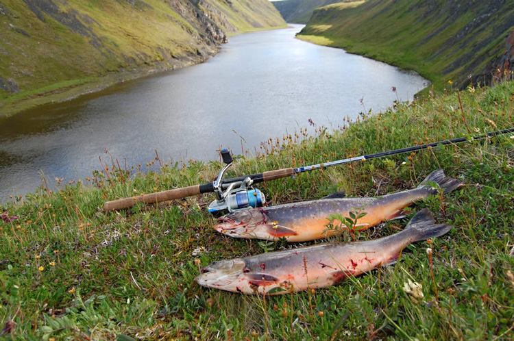Нашей целью было всё же поймать гольца на эту снасть. Но раз за разом мы вытаскивали только налимов. Из положения мы вышли следующим образом – на основную леску, выше поводка с крючком прицепили скользящий поплавок, для того, что бы приманка оказалась над дном. Вот тут дело и пошло. Правда поклёвки рыбы стали редкими, но зато в уловах начал проскакивать голец. Пока народ сидел и медитировал с донками на берегу, я решил сбегать на насосную станцию и позвонить в Амдерму.
