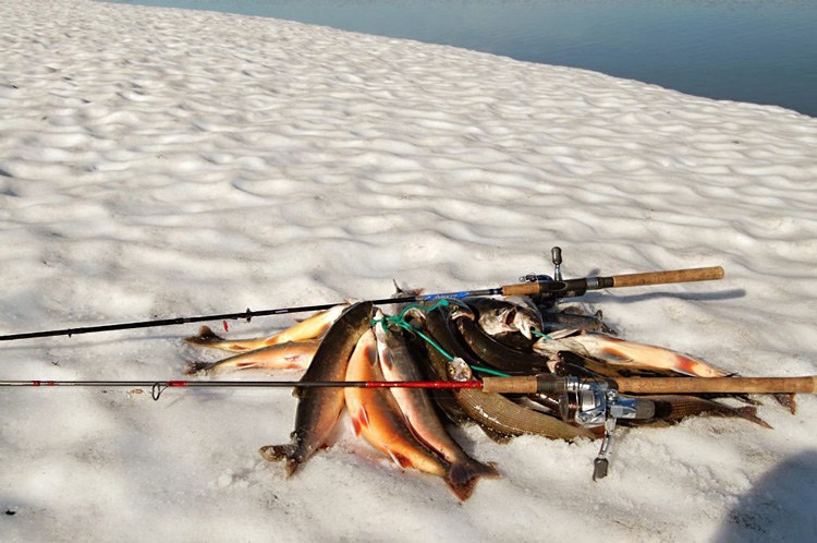 Рыбачить на озере в такую погоду можно было только с берега. Хотелось конечно попытаться поймать хорошую палию, но нужно было оборудование для троллинга, да где ж его было взять???? Вот мы и решили половить налима и если повезёт, то гольчика зацепить… Для этого мы соорудили донки. Процесс ловли, в общем то, не замысловатый. Снасть представляет из себя следующее – спиннинг с монолеской, концевой груз и чуть выше крючки. Насадкой служили кусочки хариуса, которого мы ловили тут же, на мелкие блёсны и нахлыстом на нимфы. Забрасываешь донку чуть дальше берегового свала. Это где то метров на 30. И ждёшь. Налим брал очень хорошо. Единственной проблемой было во время подсечь, иначе рыба так заглатывала крючки, что отпускать её на волю уже было бессмысленно.