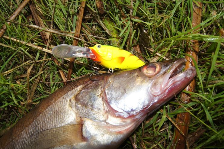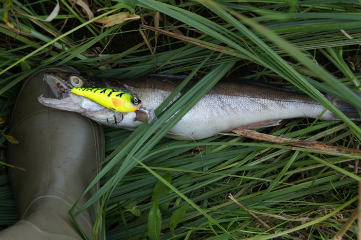 Снова забрасываю под противоположный берег по той же траектории, провожу воблер не быстро, но без пауз. В метрах пяти от берега на воблер напал неплохой судачок, грамм на 1200, не меньше, особых сложностей при вываживании не заметил, активизировался клыкастый только тогда, когда я начал освобождать его от острого тройника специальным инструментом.