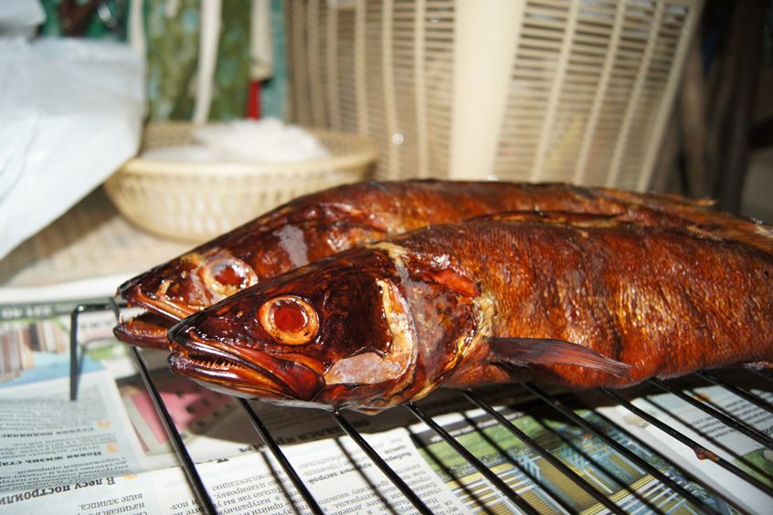 По приезду в дом, мы первым делом затопили русскую печь. Пока мой друг разжигал костер в мангале, я замочил яблоневые опилки в воде, почистил и просолил рыбу. Вскоре, когда дрова в мангале достаточно разгорелись, я раскрыл коптильню, насыпал на дно разбухшие опилки, дождался дымка и выложил просоленную рыбу на решетки, закрыл крышкой.