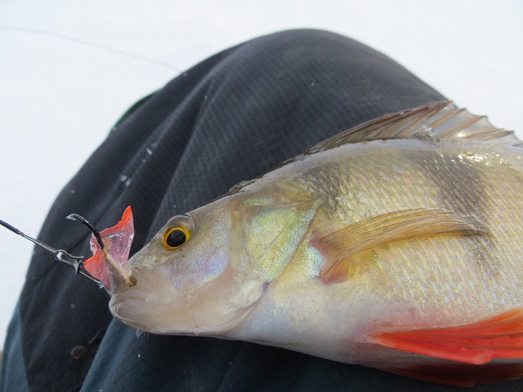 Следующий окушок попадает на спуске. При чем сегодня гораздо лучше клюет на спуске.