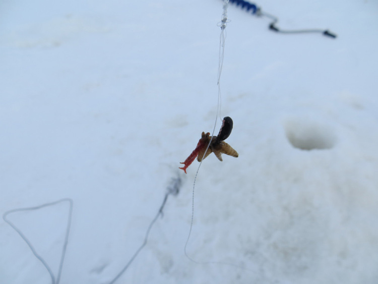 Кто-то оборвал мормышку. Вполне окуневая под «уралочку», красный медный цвет. Лидер по моим наблюдениям при лове окуня. Зачем столько наживки не понятно. Достаточно кембрика и бисеринки беленькой. И окушок будет на голую мормышку гораздо лучше ловиться, чем с наживкой.