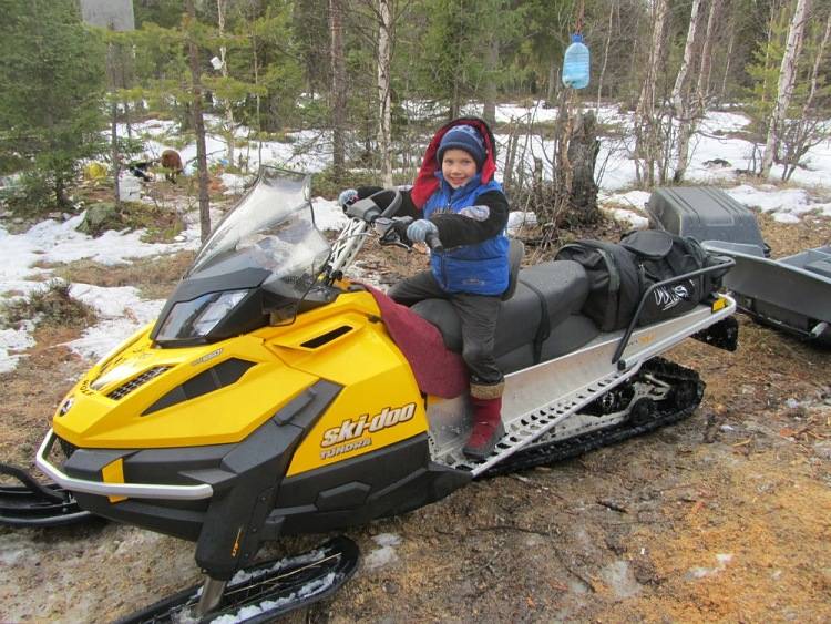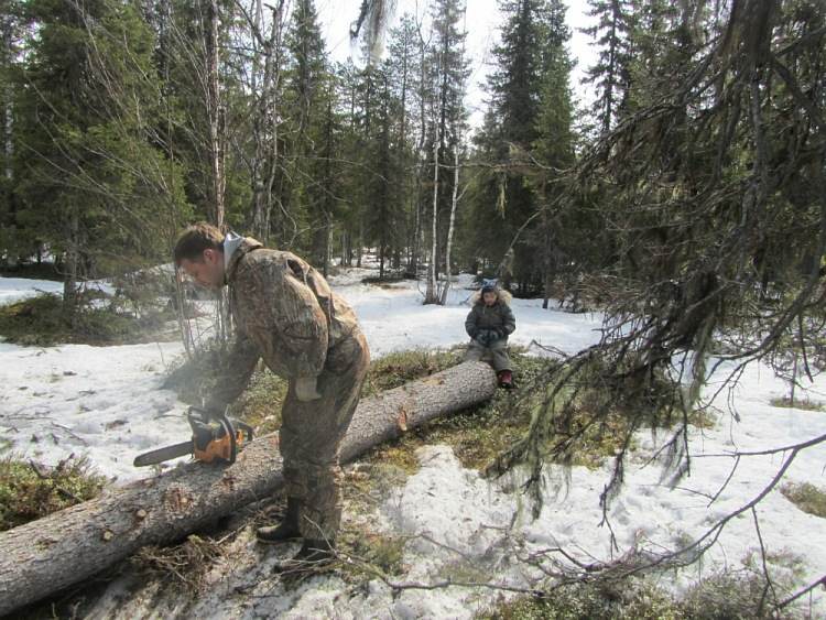 Пересели на буксировщики да вперед. Лишь Черный ручей вызывает опасение. Вода через зимник двинулась, да глубина не слишком, просматривается белый след буранки. Оглянулся, Сёмка в санках. Газ нажал да в воду съехал. Течение быстрое, струя упругая в бок собачки уперлась, еду, она ж меня с буранки в водоворот под разваленным мостом стаскивает, подворачиваю больше вверх по струе, газу добавляю. Проскочил пол шири ручья, зацепился за противоположный берег, выкарабкался. Глянь назад, третья волокуша с сынулей почти на бок завалилась и в стремнину стягивает. Миг, буксировщик стрелой тащит поезд выше на берег, и мы уж на суше. Наверн, долго буду помнить то мгновение, когда Семку качнуло. Молодец. Хоть и четырех лет, удержался за постромки, не вылетел с седла. Знать, таёжником будет.